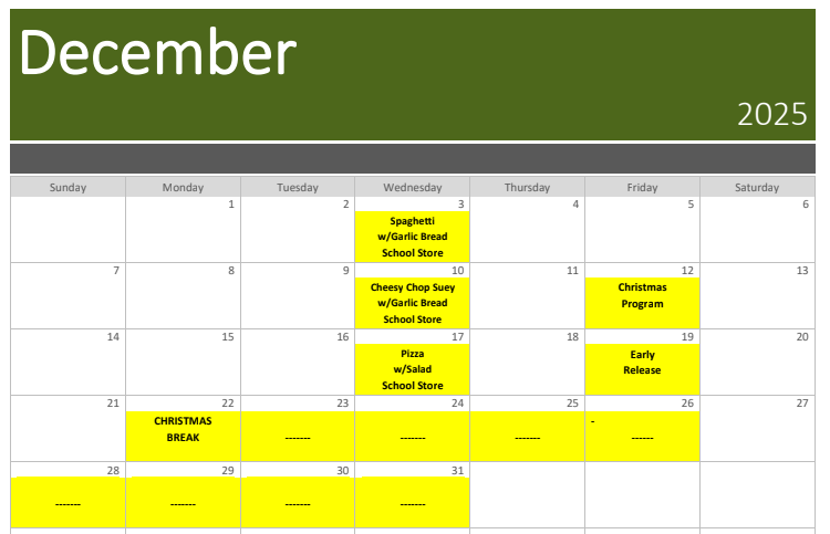 Lunch Menu 25Aug 202518 Nov 2025Add a comment Hot lunch is available each full Wednesday for $5.00 per meal. Please reserve lunch in the school office. Share this: Click to share on X (Opens in new window) X Click to share on Facebook (Opens in new window) Facebook Like Loading... Related