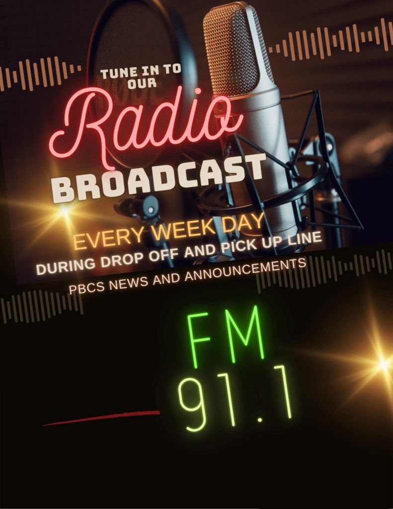 FM 91.1 19Sep 2025Add a comment Tune in your radio to 91.1 while you are in the carline to hear the latest PBCS announcements. Share this: Click to share on X (Opens in new window) X Click to share on Facebook (Opens in new window) Facebook Like Loading... Related