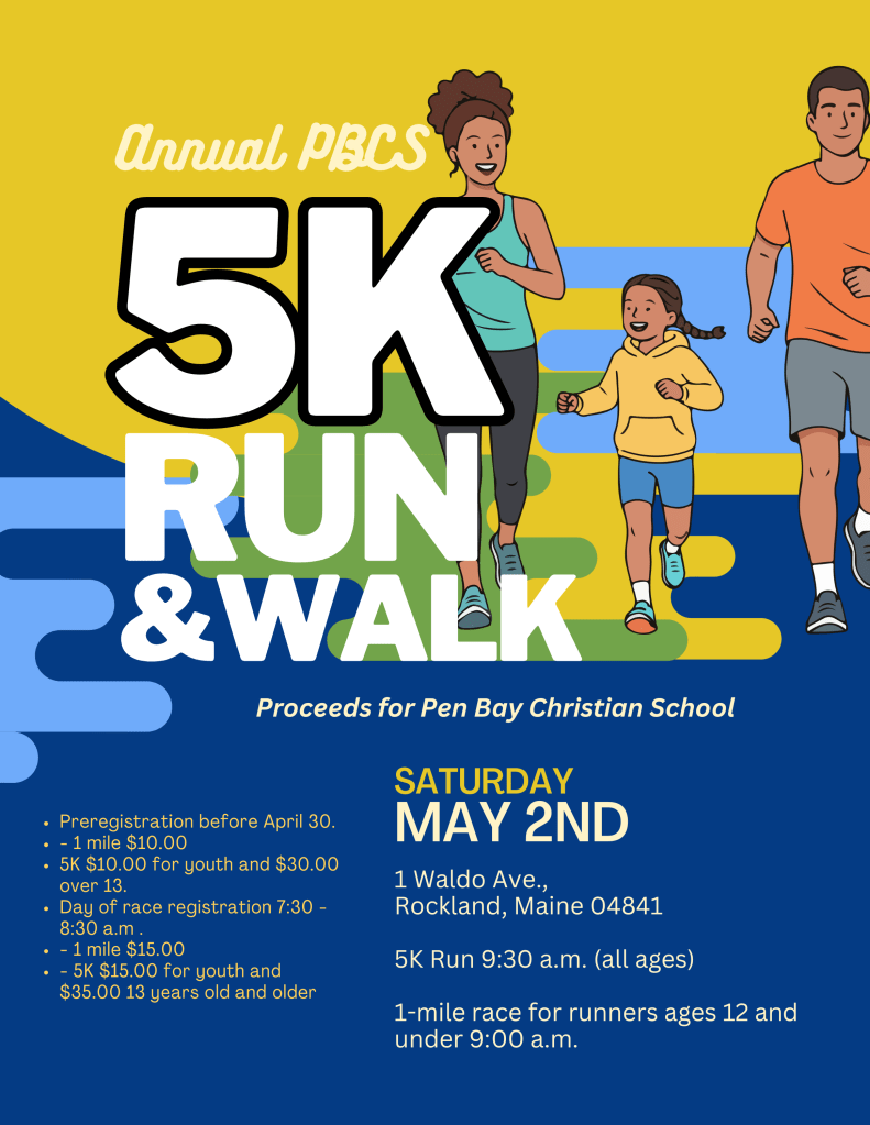 5K registration 16Apr 2026Add a comment https://runinarace.com/PenBayChristianSchool/index.html Share this: Share on X (Opens in new window) X Share on Facebook (Opens in new window) Facebook Like Loading... Related